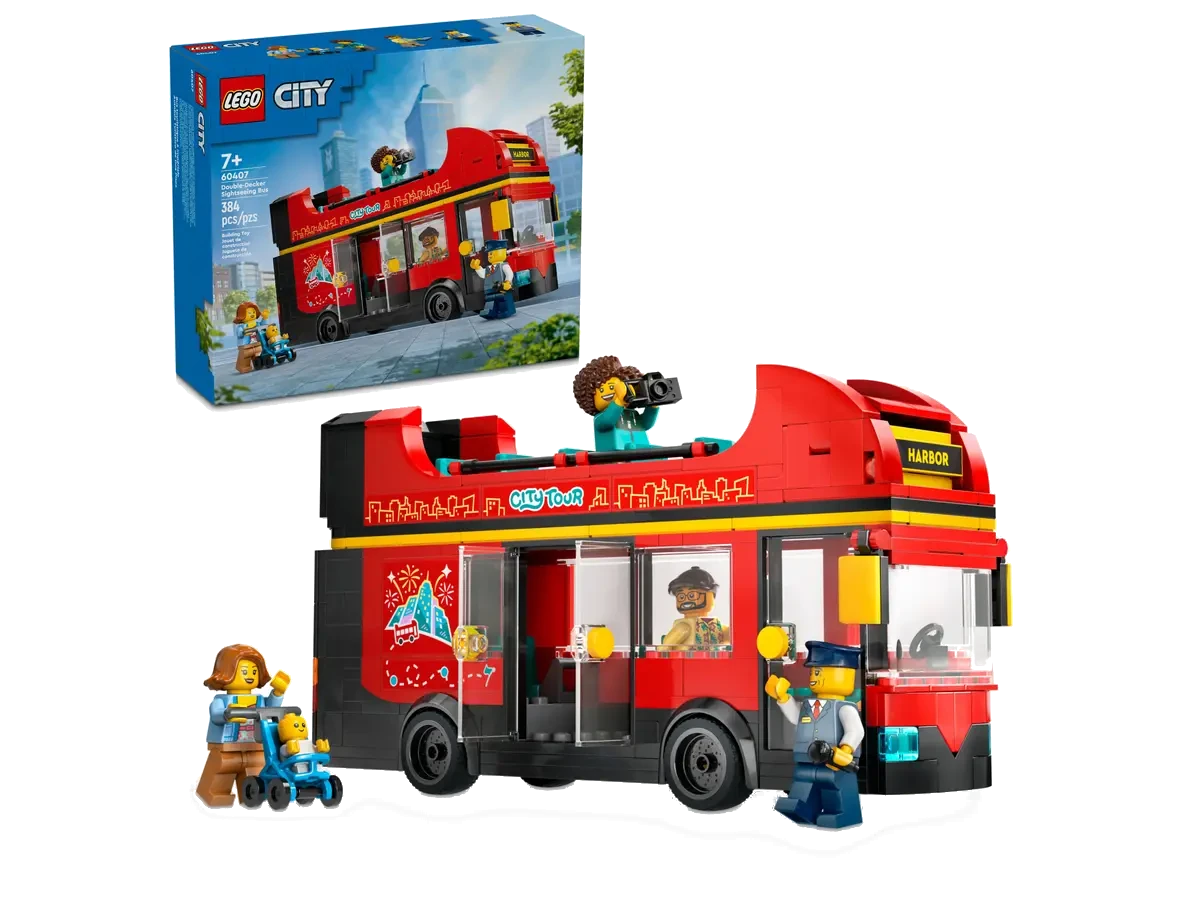 Klocki Lego City Czerwony, piętrowy autokar (60407) Wielokolorowy Zestaw Lego® City Czerwony, piętrowy autokar (60407) to wyjątkowy model dla dzieci od 7 lat, które uwielbiają pojazdy i miejskie przygody. Kultowy autobus z otwartym górnym pokładem pozwala na realistyczną zabawę w odgrywanie ról i świetnie prezentuje się także na półce. Korzyści: - 384 elementy – komplet części do zbudowania piętrowego autobusu o wymiarach 11 × 21 × 6 cm. - Pięć minifigurek – w tym małe dziecko w wózku, pasażerowie i kierowca, które urozmaicają zabawę. - Interaktywne funkcje – obracana tablica z celem podróży (np. muzeum, park, port, śródmieście). - Realistyczne akcesoria – mikrofon, telefon i aparat dla minifigurek, wspierające kreatywne scenki. - Instrukcje 3D w aplikacji Lego® Builder – możliwość obracania i powiększania modelu w trakcie budowy. - Kompatybilność z Lego® City – autobus można połączyć z innymi zestawami, tworząc większe miasto. - Rozwój wyobraźni – zabawa w podróże, wycieczki i codzienne życie w Lego® City. Lego® City Czerwony autobus – realistyczny model z detalami. Autobus piętrowy został zaprojektowany tak, by przypominał prawdziwy miejski autokar turystyczny. Dolny pokład służy do wygodnego przewożenia pasażerów, a górny – widokowy pozwala podziwiać panoramę miasta. Obracana tablica z celem podróży dodaje zabawie dynamiki i pozwala dzieciom decydować, dokąd autobus pojedzie. Minifigurki i akcesoria Lego® – zabawa w odgrywanie ról. W zestawie znajduje się 5 minifigurek, w tym małe dziecko w wózku, kierowca oraz pasażerowie. Dzięki dodatkowym akcesoriom – mikrofonowi, telefonowi i aparatowi – dzieci mogą tworzyć własne historie, od wycieczek szkolnych po turystyczne wyprawy po mieście. Aplikacja Lego® Builder – cyfrowe wsparcie budowania. Oprócz tradycyjnych instrukcji drukowanych zestaw oferuje dostęp do aplikacji Lego® Builder. To narzędzie pozwala obracać model w 3D, przybliżać detale i śledzić postępy budowy. Dzięki temu dzieci łatwiej zrozumieją konstrukcję i szybciej osiągną efekt końcowy. Dla kogo zestaw Lego® City Czerwony, piętrowy autokar? Autobus piętrowy to idealny prezent dla dzieci od 7 lat, które lubią pojazdy i kreatywną zabawę. Model świetnie sprawdzi się zarówno jako element kolekcji Lego® City, jak i samodzielna zabawka. Dzięki kompatybilności z innymi zestawami można tworzyć rozbudowane scenariusze miejskich przygód.