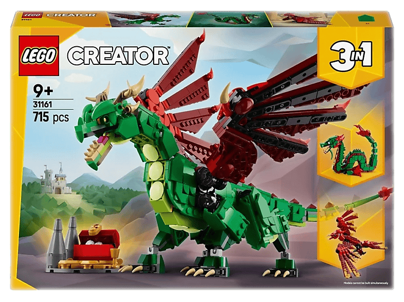 Klocki Lego Creator Średniowieczny smok 31161 Wielokolorowy Lego Creator 3 w 1 Średniowieczny smok (31161) to zestaw, który przenosi dzieci w świat fantasy pełen magii i przygód. Dzięki możliwości budowy aż trzech różnych modeli – smoka, feniksa oraz gryfa – zestaw zapewnia ogromną regrywalność i rozwija kreatywność. Najważniejsze korzyści: - Zestaw 3 w 1 – możliwość zbudowania smoka, feniksa lub gryfa - Ruchome elementy – skrzydła, nogi, głowa i szczęka smoka można ustawiać w różnych pozach - Średniowieczny klimat – zestaw idealny dla fanów fantasy i legend o smokach - Kreatywna zabawa – rozwija wyobraźnię i zdolności konstrukcyjne dzieci - Kolorowa konstrukcja – wielokolorowe elementy tworzą efektowną figurkę smoka - Łatwe instrukcje – drukowane i cyfrowe w aplikacji Lego Builder - Świetny prezent – idealny dla dzieci od 9 lat, które lubią budować i odgrywać przygody. Komfort zabawy na co dzień Dzięki ruchomym elementom smok może przyjmować różne pozy, co pozwala dzieciom odgrywać własne historie i sceny bitewne. Możliwość przebudowy zestawu na feniksa lub gryfa sprawia, że zabawa nigdy się nie kończy. Dla kogo ten produkt? Dla dzieci od 9 lat, które kochają fantasy, legendy i kreatywne budowanie. Idealny dla fanów smoków i magicznych stworzeń.