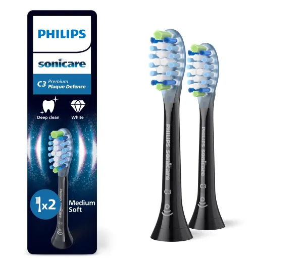 Kolor:czarny;Liczba sztuk w opakowaniu:2 szt.;Marka/Seria:Philips Sonicare;Model:DiamondClean, DiamondClean Smart, EasyClean, Essence+, FlexCare, FlexCare+, FlexCare Platinum, FlexCare Platinum Connected, HealthyWhite, HealthyWhite+, PowerUp, ProtectiveClean;Z wyjątkiem: Philips One;Pojemność:0 ml;Rodzaj główki:soniczna;Rodzaj produktu:końcówki do szczoteczek;Wariantowanie seria:Philips Sonicare C3 Premium Plaque Defence...